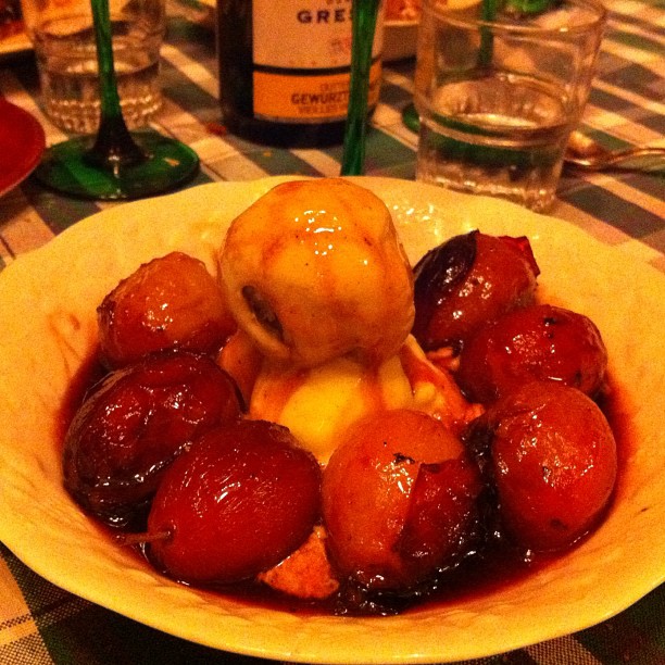 Chaud-froid: savoureuses quetsches (prunes) avec crème glacée au pain d’épices (Au Coin des pucelles).