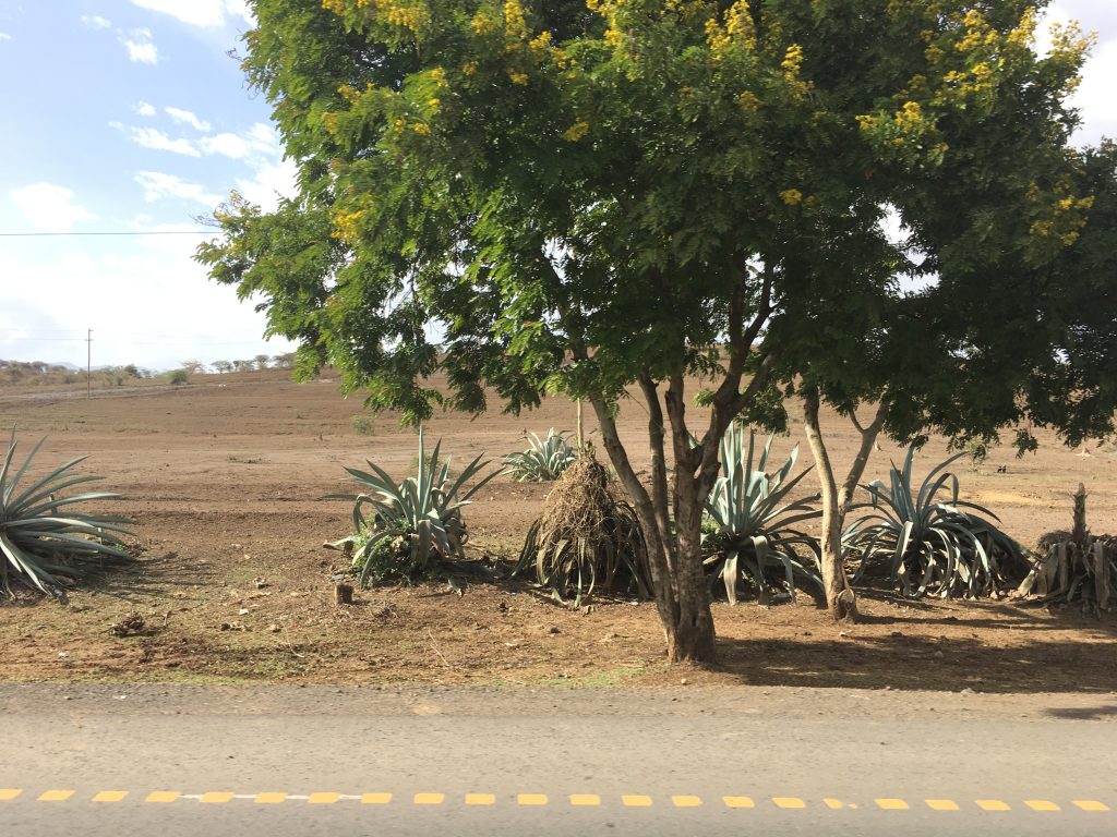Deux jeunes garçons font du stop, jerricans à la main. Geoffrey pointe une plantation de café. Les plantes grisâtres qu’on aperçoit le long de la route ? Du sisal. Google me confirme plus tard que je n’ai pas halluciné : ce sont bel et bien les mêmes qu’au Mexique. On les utilise pour fabriquer des cordes.