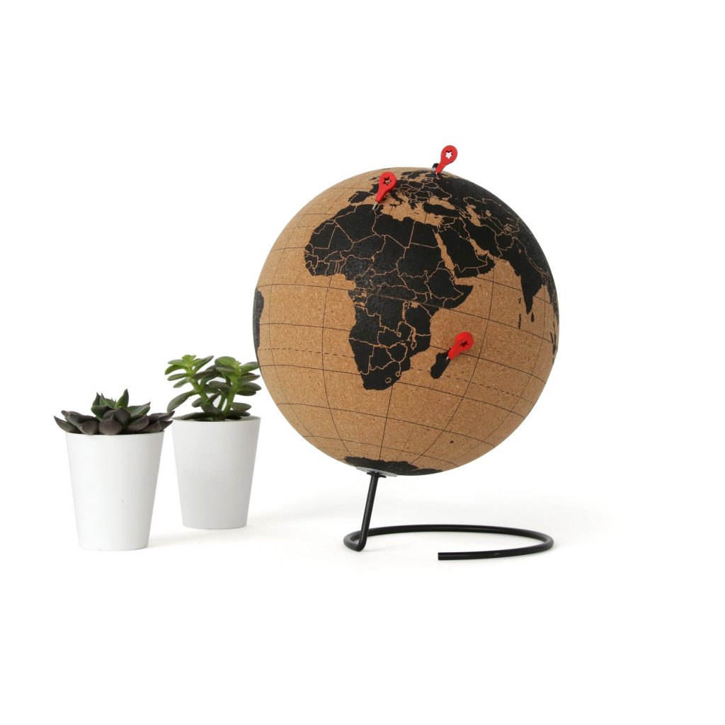 Autre suggestion : un globe-terrestre en liège, pour pouvoir mettre des punaises sur les endroits visités ou les destinations qui nous font rêver ! On en trouve chez Omer DeSerres.