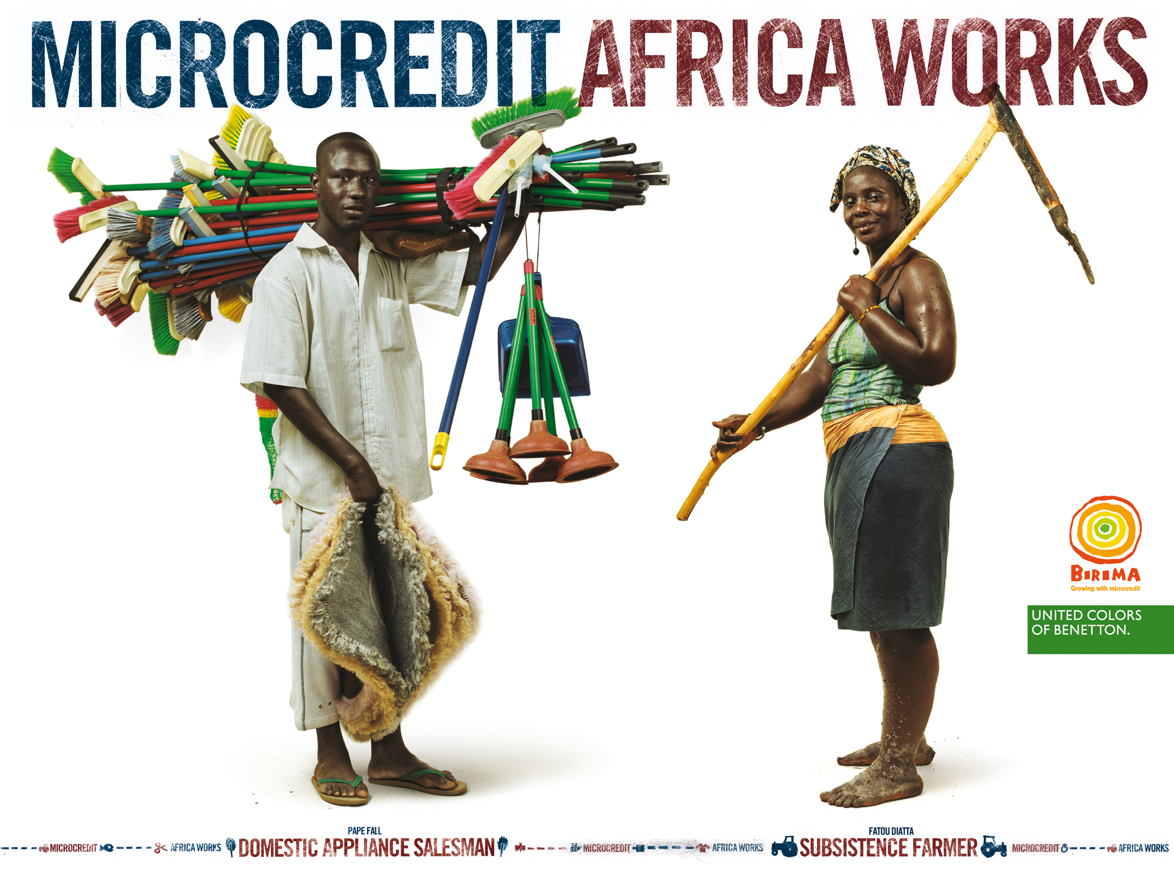 « Africa Works repose sur une idée simple: encourager la création de petites entreprises locales grâce à du microcrédit, c’est-à-dire des petits prêts à des taux très bas, a-t-il expliqué à L’Express. Le demandeur ne doit fournir aucune autre garantie que sa parole et la respectabilité de sa famille. ça peut marcher. À plusieurs reprises, des Sénégalais m’ont demandé une aide financière, mais aucun n’a voulu un don. Ils ont tous tenu à me rembourser. Voilà pourquoi, un jour, j’ai mis 200 millions de francs CFA (300 000 A) sur la table et j’ai fondé Birima, une société de microcrédit à laquelle s’est associé Benetton. » C’est le photographe de la griffe, James Mollison, qui signe les photos de la campagne publicitaire.