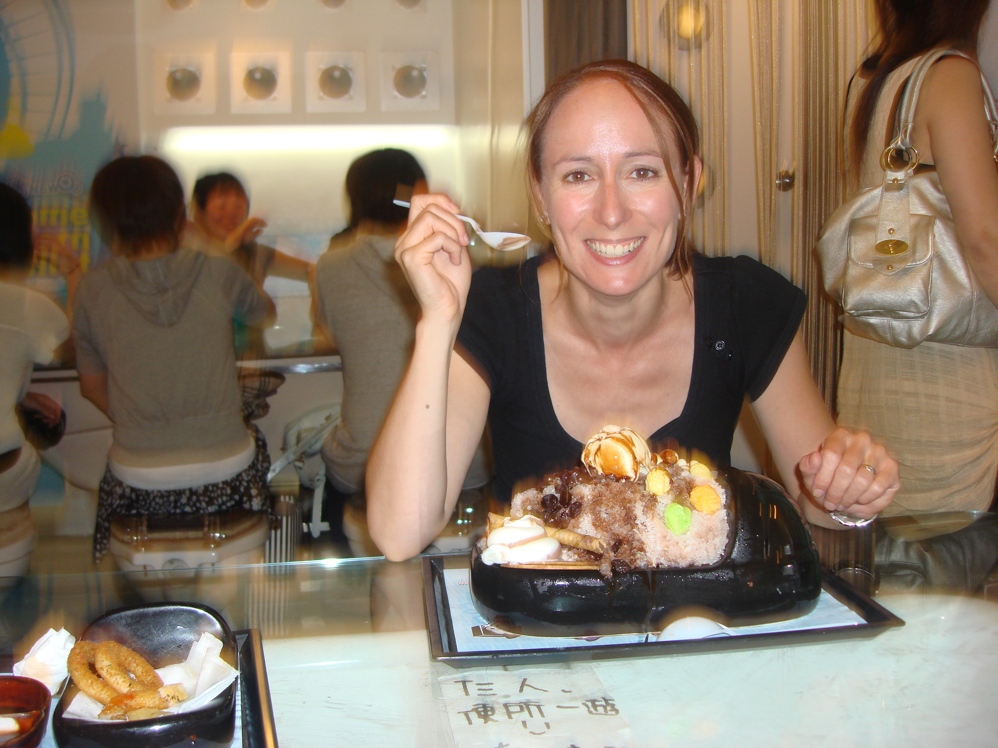 Maintenant, la question qui tue: alors Marie-Ju, ça goûte la m**** ou pas? Honnêtement, les mets que nous avons commandés n’ont pas été à la hauteur de nos attentes. Surtout que nous avons dû patienter pendant 45 minutes avant d’avoir une table… Chéri a opté pour un poulet au curry et Bébé et moi nous sommes contentées de frites et d’oignons français (une erreur de la part du serveur, j’avais plutôt demandé des calmars frits) puisque nous venions de manger des dumpings en nous baladant dans le quartier. Présentée dans un urinoir rempli de glace concassée et décorée de bonbons et de biscuits, notre crème glacée était beaucoup plus agréable à regarder qu’à manger (en fait, elle goûtait l’eau plus que la crème).