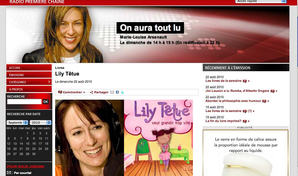 Tout ça pour dire que j’en ai dit, des niaiseries, à l’émission On aura tout lu, animée par Marie-Louise Arsenault. Disons que j’avais laissé mon «filtre» à la maison! J’ai eu beaucoup de plaisir, mais j’avoue que je suis moins dans ma zone de confort quand vient le temps de faire une entrevue «d’auteure» (ah! si vous saviez à quel point ça me fait plaisir de me faire présenter ainsi) qu’une chronique qui fait appel à mon bagage de journaliste.