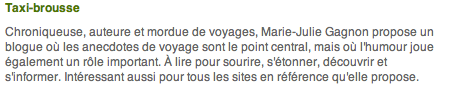 Autrice, journaliste, recherchiste, chroniqueuse, machine à idées et questionneuse en série, Marie-Julie Gagnon se définit d’abord comme une exploratrice. Elle collabore à de nombreux médias québécois et internationaux depuis plus de 25 ans. Elle a publié une quinzaine de livres, dont les essais « Voyager mieux : est-ce vraiment possible ? » (Québec Amérique, 2023), « Que reste-t-il de nos voyages ? » (Éditions de l'Homme, 2019) et le récit «Cartes postales du Canada » (Michel Lafon, 2017), en plus de diriger les deux tomes du collectif « Testé et approuvé : le Québec en plus de 100 expériences extraordinaires » (Parfum d'encre, 2017 et 2023) et de coécrire « Le voyage pour les filles qui ont peur de tout », (Michel Lafon, 2015 / 2020). Elle a lancé le blogue Taxi-brousse en 2008 et visité plus d'une soixantaine de pays, dont le Canada, qu'elle ne se lasse pas de sillonner de long en large.