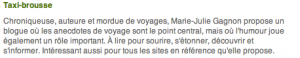Autrice, journaliste, recherchiste, chroniqueuse, machine à idées et questionneuse en série, Marie-Julie Gagnon se définit d’abord comme une exploratrice. Elle collabore à de nombreux médias québécois et internationaux depuis plus de 25 ans. Elle a publié une quinzaine de livres, dont les essais « Voyager mieux : est-ce vraiment possible ? » (Québec Amérique, 2023), « Que reste-t-il de nos voyages ? » (Éditions de l'Homme, 2019) et le récit «Cartes postales du Canada » (Michel Lafon, 2017), en plus de diriger les deux tomes du collectif « Testé et approuvé : le Québec en plus de 100 expériences extraordinaires » (Parfum d'encre, 2017 et 2023) et de coécrire « Le voyage pour les filles qui ont peur de tout », (Michel Lafon, 2015 / 2020). Elle a lancé le blogue Taxi-brousse en 2008 et visité plus d'une soixantaine de pays, dont le Canada, qu'elle ne se lasse pas de sillonner de long en large. Certains voyagent pour voir le monde, elle, c’est d’abord pour le « ressentir » (et, accessoirement, goûter tous les desserts au chocolat qui croisent sa route). Sur Twitter, Instagram et TikTok: @mariejuliega. Sur Facebook: facebook.com/montaxibrousse/