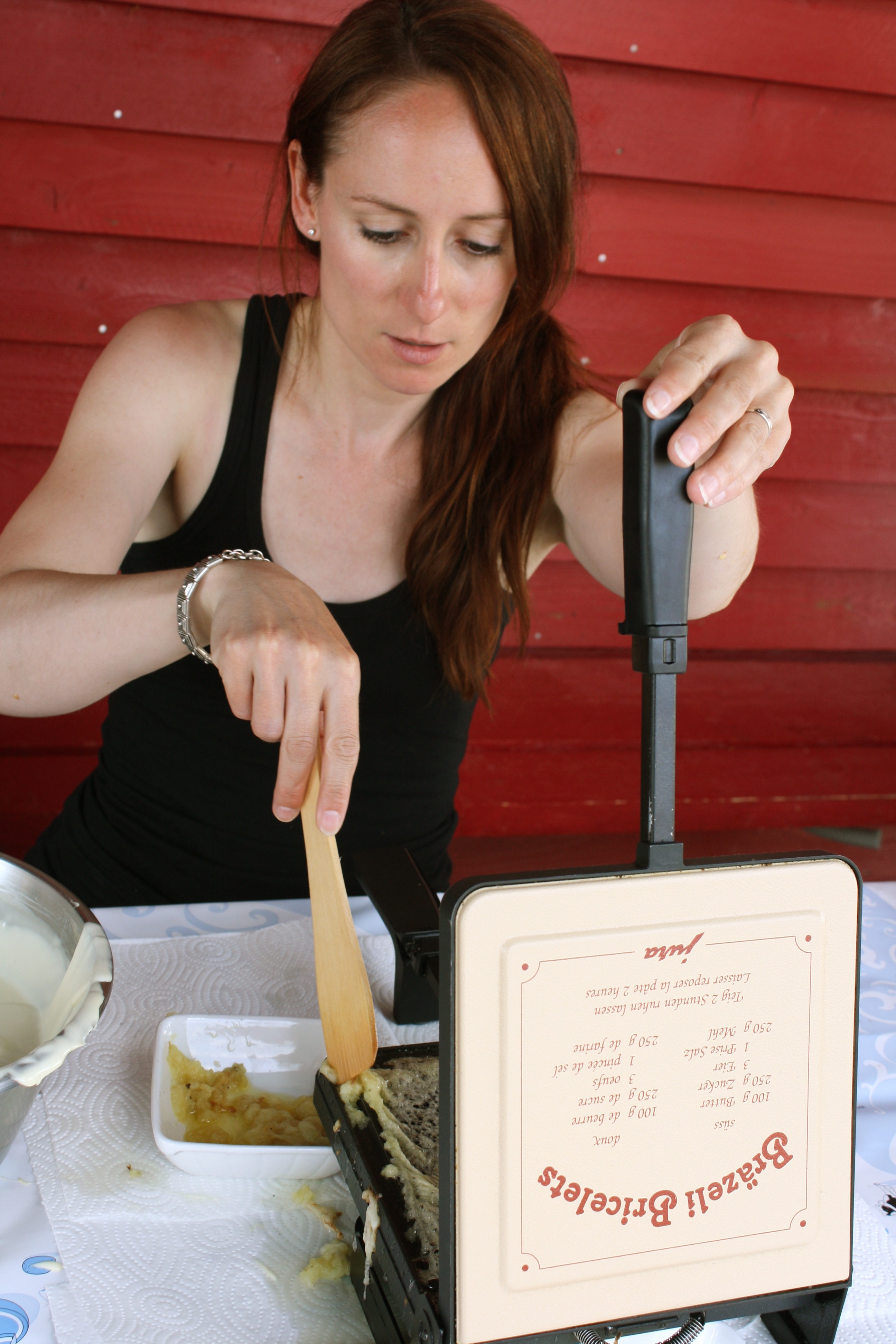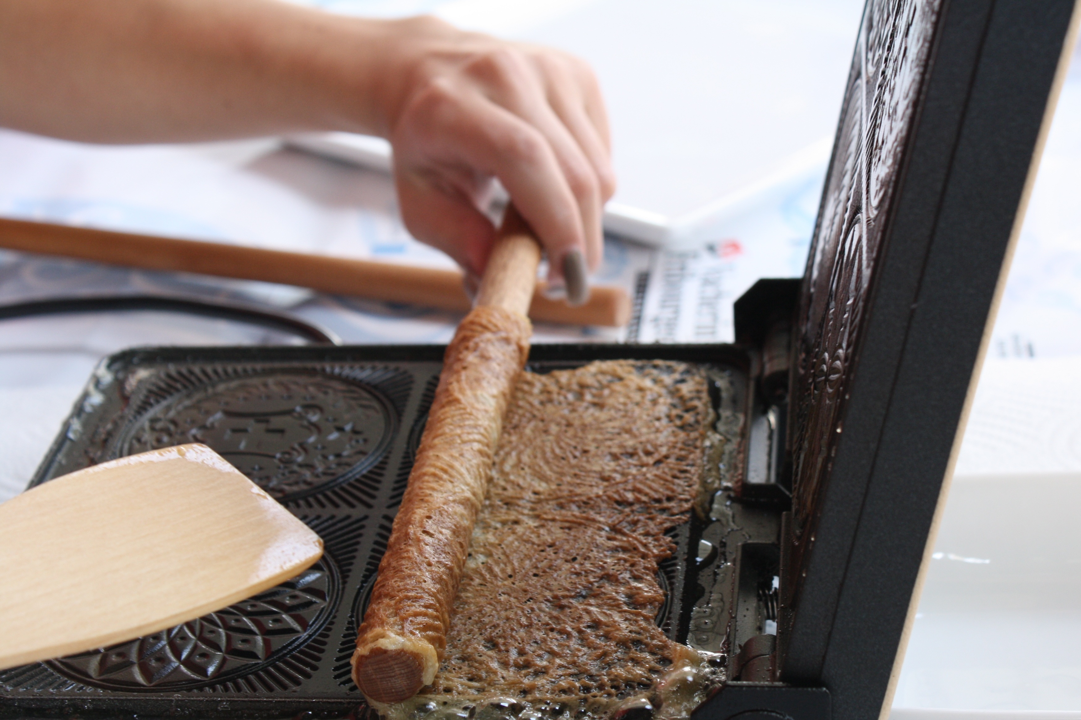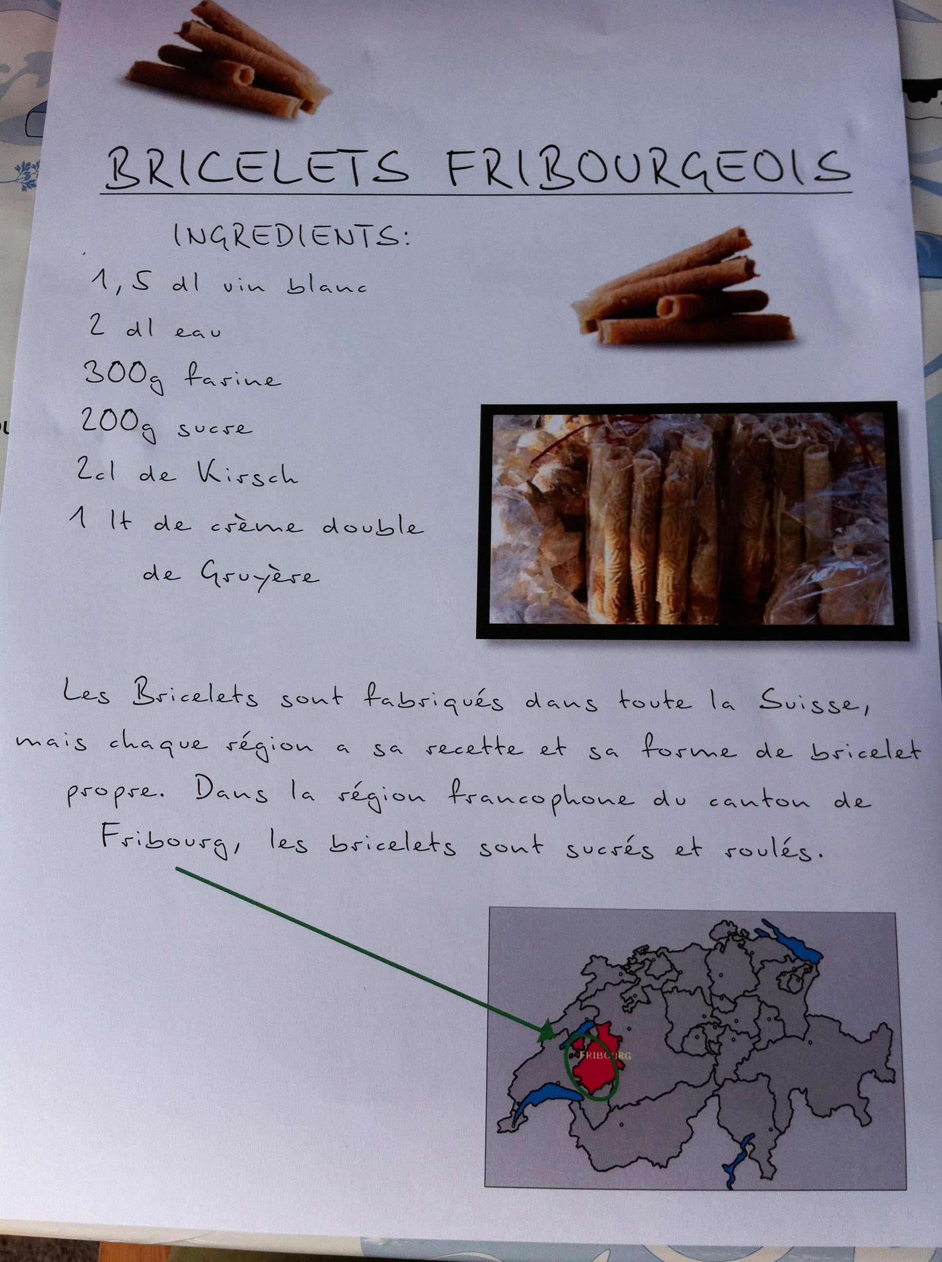 En plus d’y déguster la meilleure fondue moitié-moitié de ma vie, d’être initiée au menu de La Bénichon et à la meringue accompagnée de crème double (j’en salive encore – j’en ai pris une double portion, que je mangeais à la cuillère comme une soupe), j’y ai appris à rouler des bricelets, gaufres minces et croustillantes qu’on déguste plates ou en rouleaux.