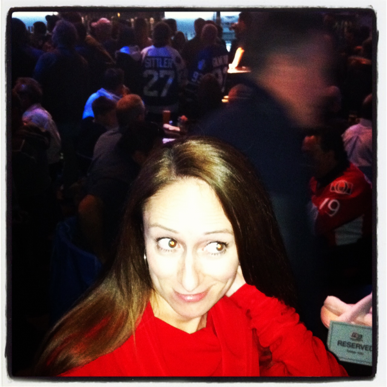 Moi. Dans un bar sportif. En ROUGE (je vous jure que ce n’était pas prémédité). Un chihuahua dans un jeu de quilles Labatt bleue, genre (je ne bois pas de bière, alors ne me demandez pas ce qu’ingurgitaient les quidams qui trinquaient avec leurs ailes de poulet 911-de-luxe).