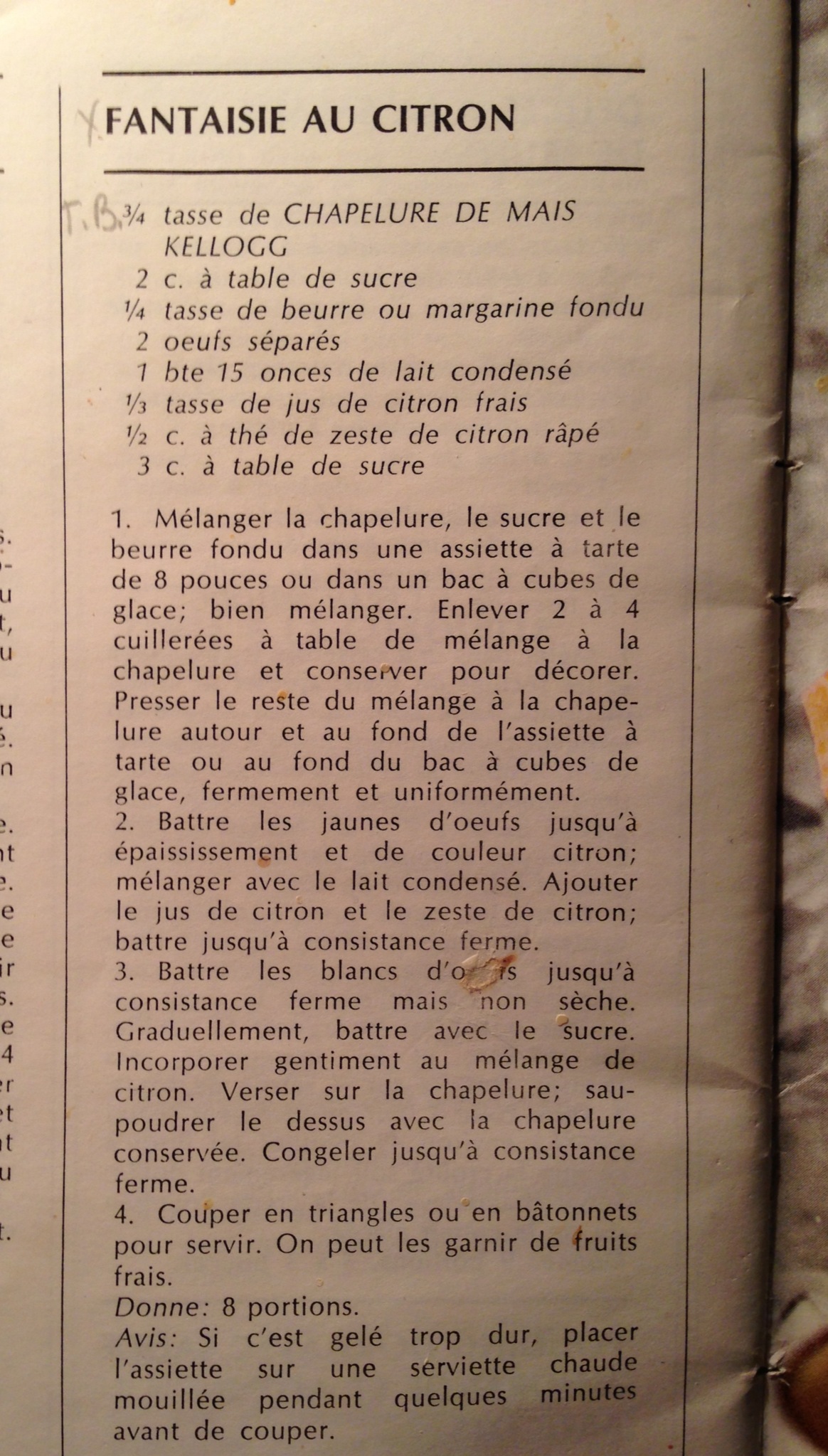 Je l’ai souvent mentionné: j’aime autant manger que je déteste cuisiner. Je raffole particulièrement des desserts. C’est un peu (beaucoup) la faute de ma mère, qui adore en faire. Chaque fois que je viens visiter mes parents au Lac-Saint-Jean (j’y suis là là: je reviens de dormir avec des loups, puis avec des caribous… hâte de vous raconter!), elle nourrit mon obsession sucrée. L’un de mes péchés favoris? La fantaisie au citron, sorte de tarte glacée très très sucrée.