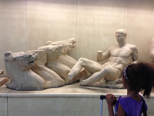 La visite s’avère un franc succès. Nous cassons la croûte au restaurant du musée (abordable et franchement très bon) avant de nous balader dans les différentes salles. Maya est fascinée par tous ces bouts de sculptures et spécule sur le sort réservés aux bras et autres membres manquants.