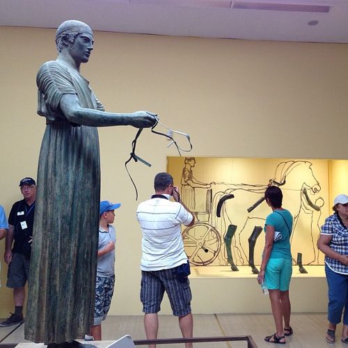 La visite du musée complétera celle du site archéologique. Nous y admirons entre autres le Philosophe, un sphynx (ceux des Grecs avaint des têtes de femmes) et L’aurige de Delphes, l’une des oeuvres les plus célèbres du musée. Faite de bronze, ses yeux sont en onyx… Des cils de fer ont même été ajoutés! Un regard troublant.