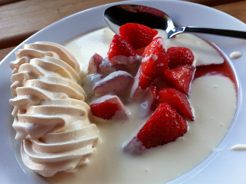 Le bonheur est désormais pour moi nappé de crème double. N’ayant subi aucune transformation, elle reste d’une douceur infinie. D’une richesse infinie (ou presque), aussi, puisqu’on parle quand même d’une crème à 40 à 45 %. Dégustée avec des fraises et la meringue cuite au four à bois, croustillante là où il faut, on parle carrément de paradis. Ou de péché…