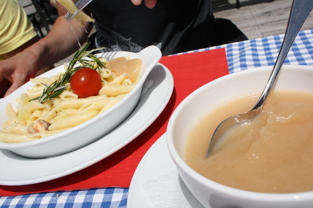 Banales pâtes nappées de fromage? Que nenni! Riche à souhait, on accompagne ce macaroni contenant pommes de terre, lardons, fromage et crème d’une compote de pommes. Je vous l’accorde: on est loin du raffinement. Mais après une randonnée dans les Alpes, avec les pics enneigés en toile de fond, c’est tout à fait dans le ton.
