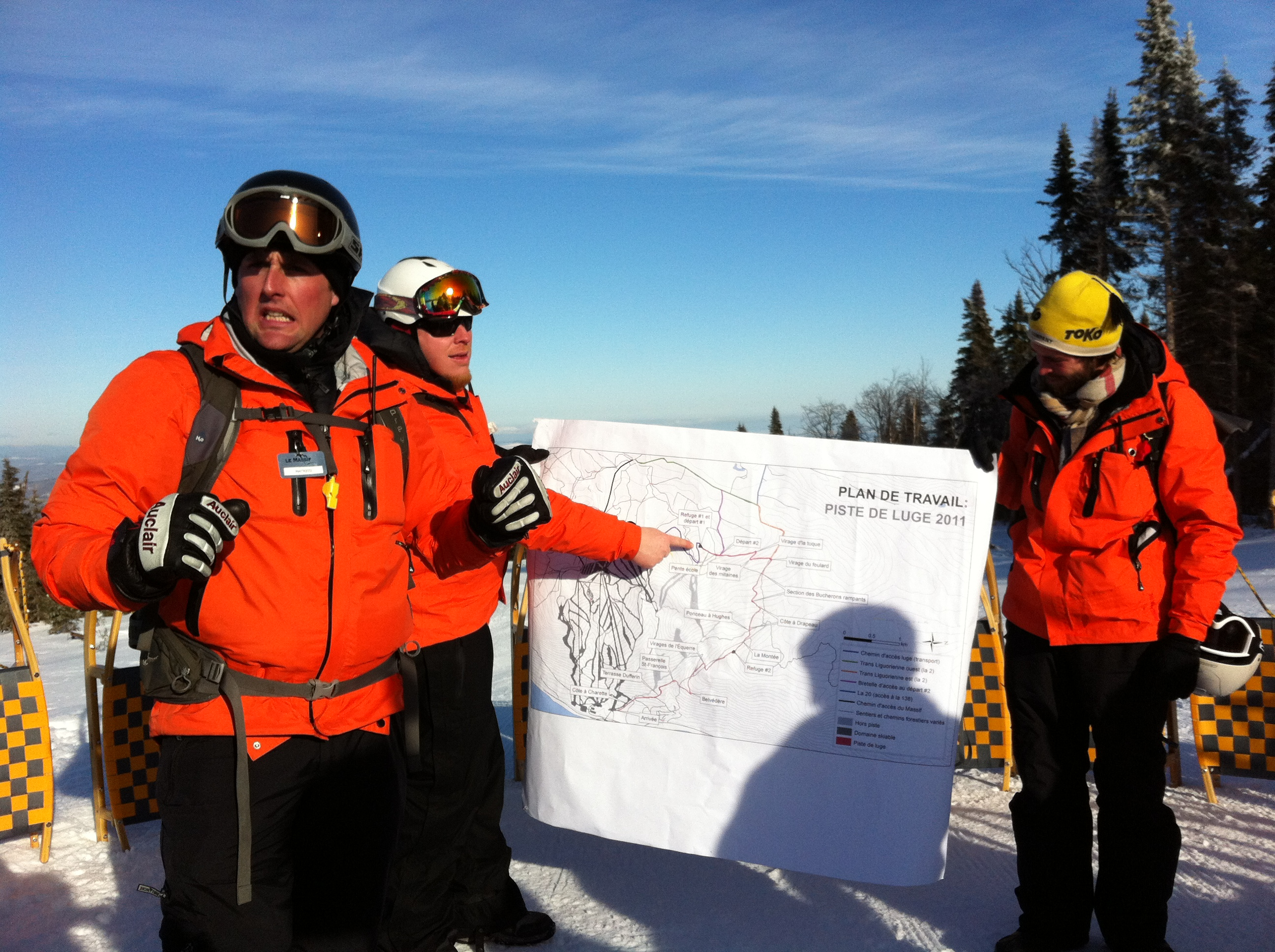 Mont Liguori. Coiffée d’un casque de sécurité et lunettes de ski bien en place, je m’apprête à dévaler 7,5 kilomètres sur une luge fabriquée non loin de Wendake. L’équipe de guides (sur la photo ci-bas: Mathieu, Félix et Benjamin) explique le trajet à l’aide d’une carte, précisant les endroits où nous devrons nous arrêter en cours de route, puis nous montre comment contrôler la luge.