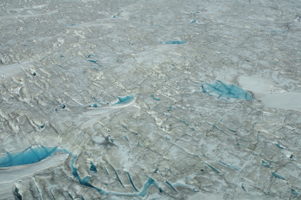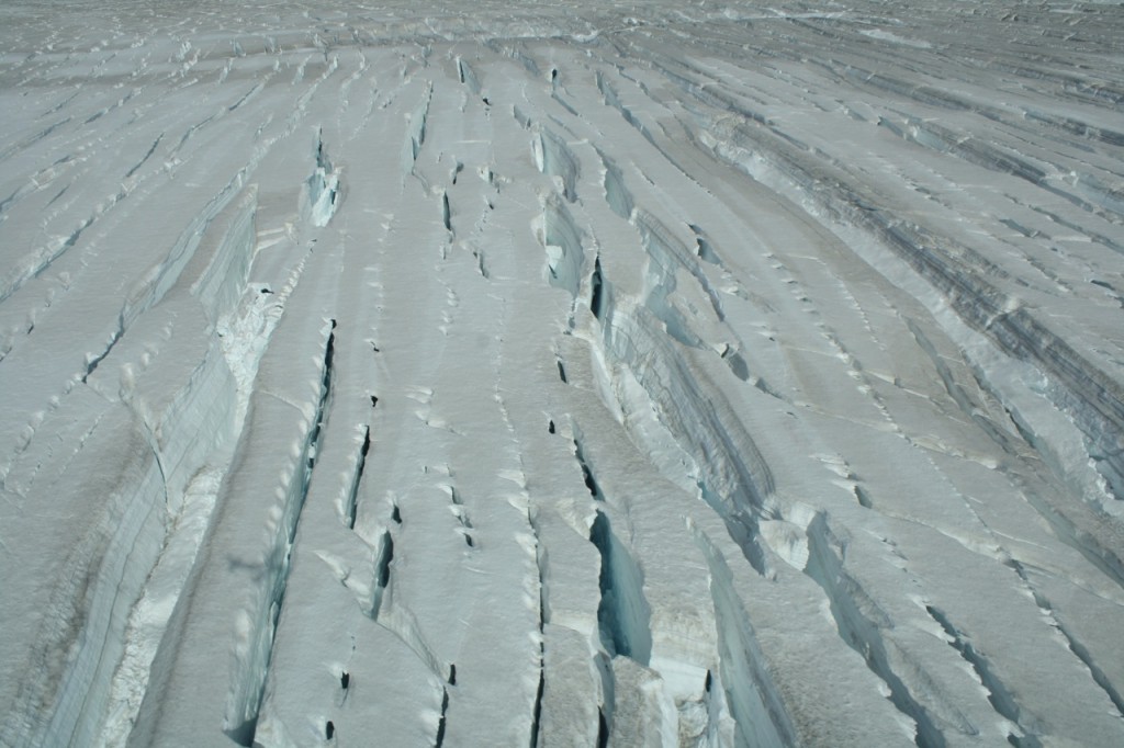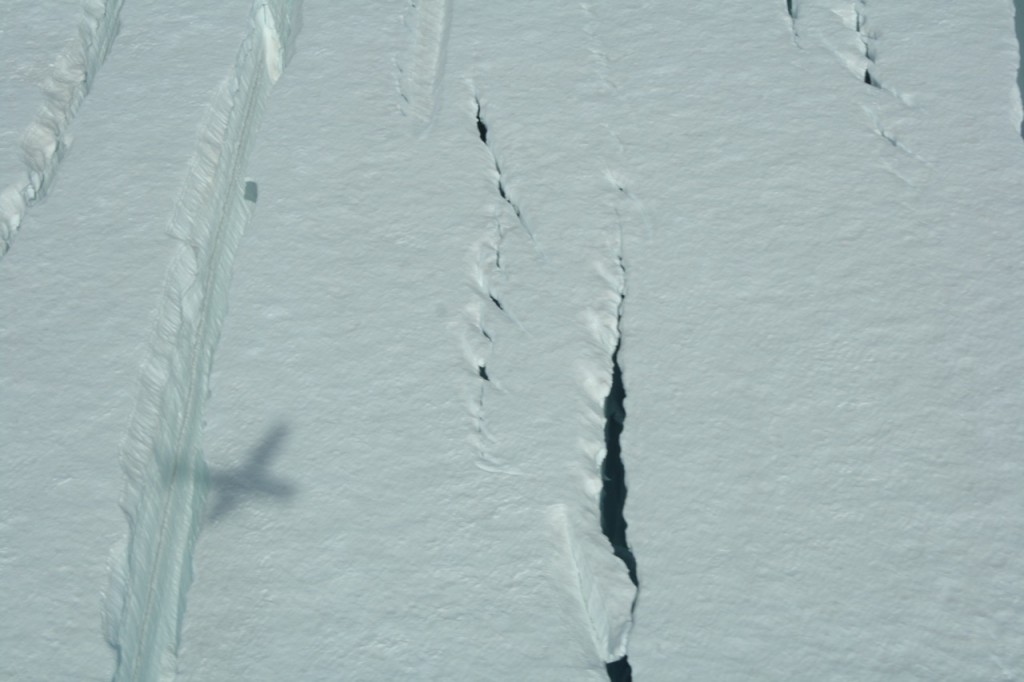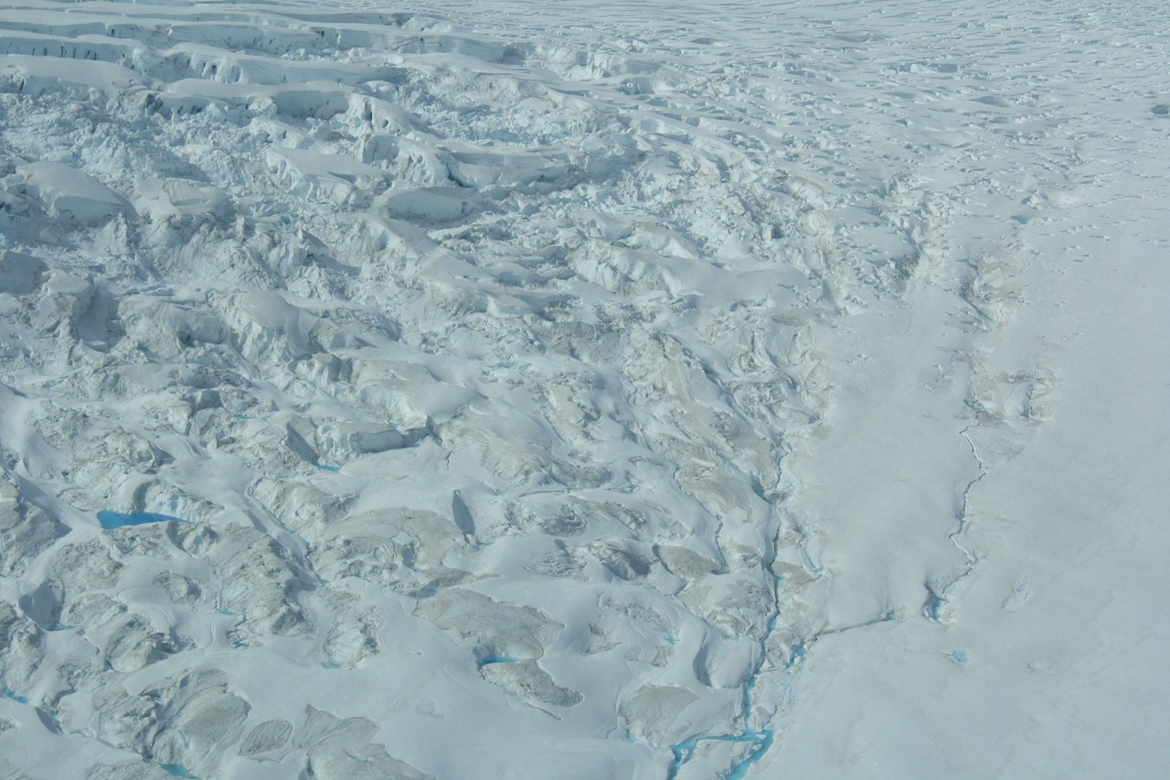 Nous nous approchons du sol fissuré. Plus nous descendons, plus nous constatons les détails de cette toile magistrale. Les crevasses semblent sans fin. Plus tard, nous apercevrons aussi des icebergs.