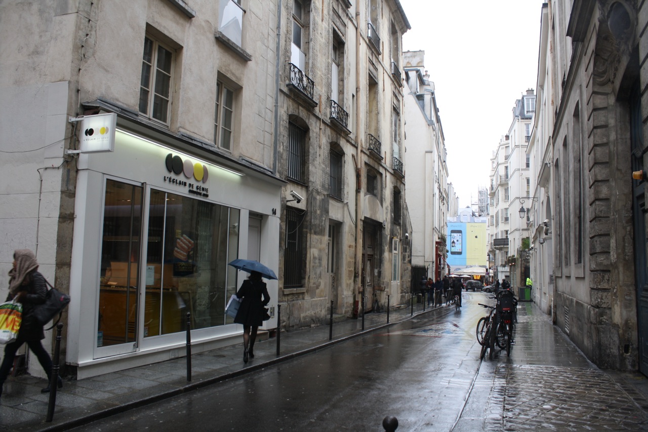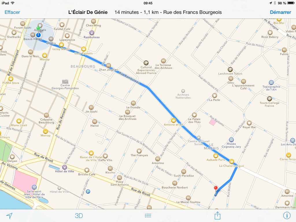 Mon quartier: Beaubourg, à deux pas du Marais et des Halles. En me faisant des itinéraires avec «Plans», sur mon iPhone (je SUIS le point bleu!), je constate que toutes les adresses où je me suis promis d’aller se trouvent à une distance de marche de 8 à 37 minutes! Vous avez dit bien situé?