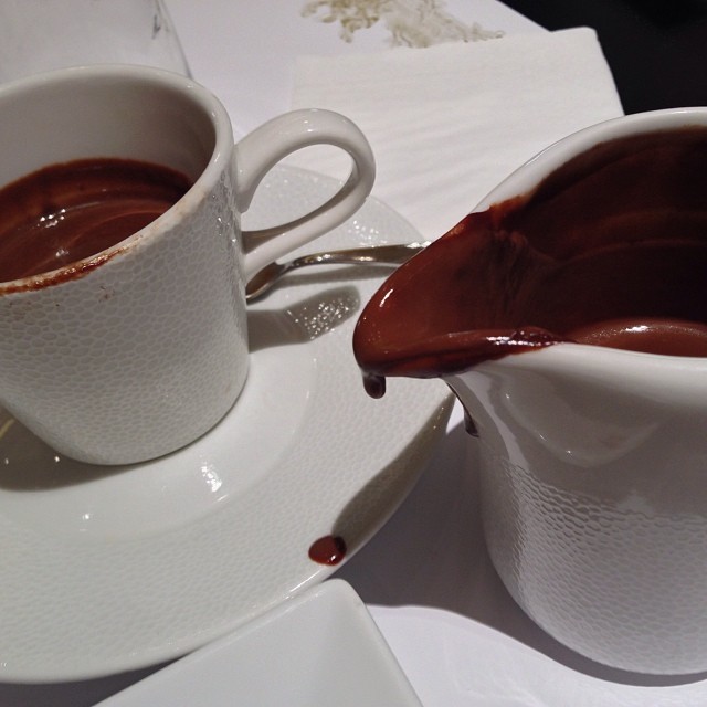 Quoi? Tu ne déclares même pas Jean-Paul Hévin grand vainqueur? vous entends-je protester en choeur. Eh ben non. Mes critères sont bien personnels. Pour moi, un chocolat chaud doit être bien onctueux – voire trop épais. La goutte que vous voyez perler sur le bord de ma tasse de chocolat Dalloyau, en haut de ce billet, indique, à mon avis, la texture parfaite. Celui de Fouquet’s m’a prise par surprise. Je ne m’attendais pas à autant de grâce et, oserais-je dire, de «profondeur» dans un lieu jugé snob et surfait par tant de gens. Le secret est peut-être aussi dans l’effet de surprise, me direz-vous.