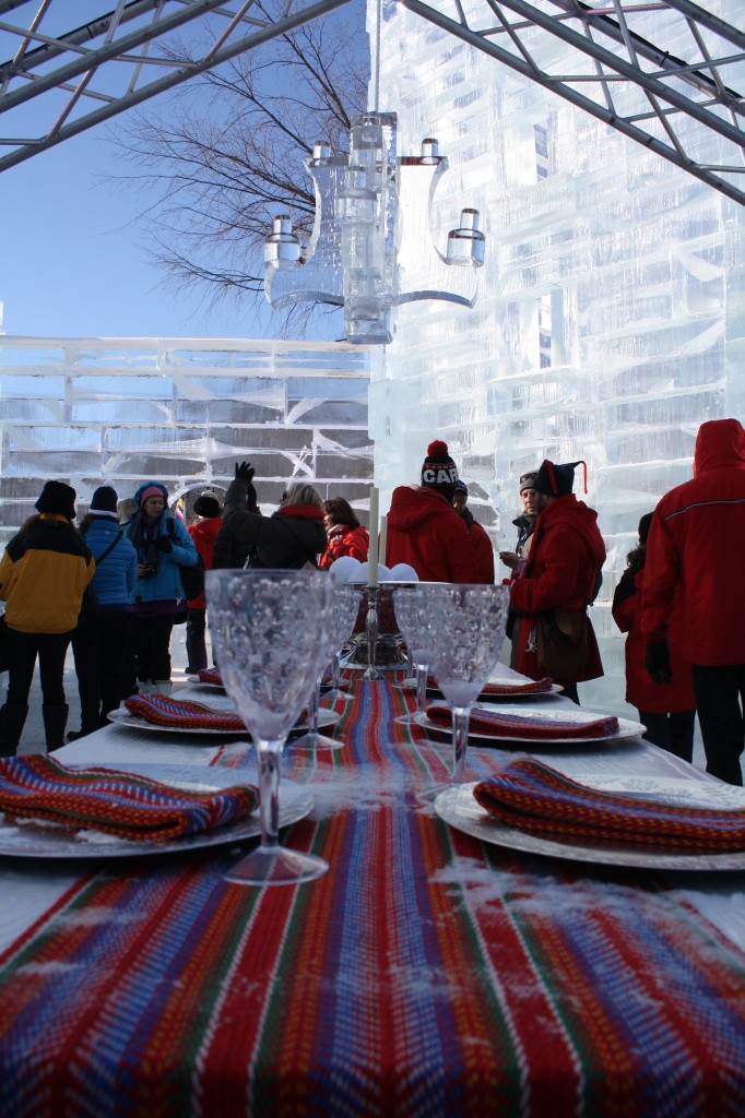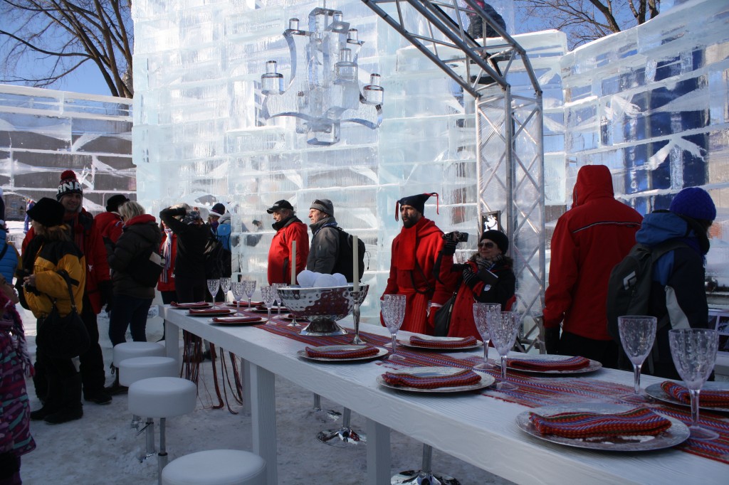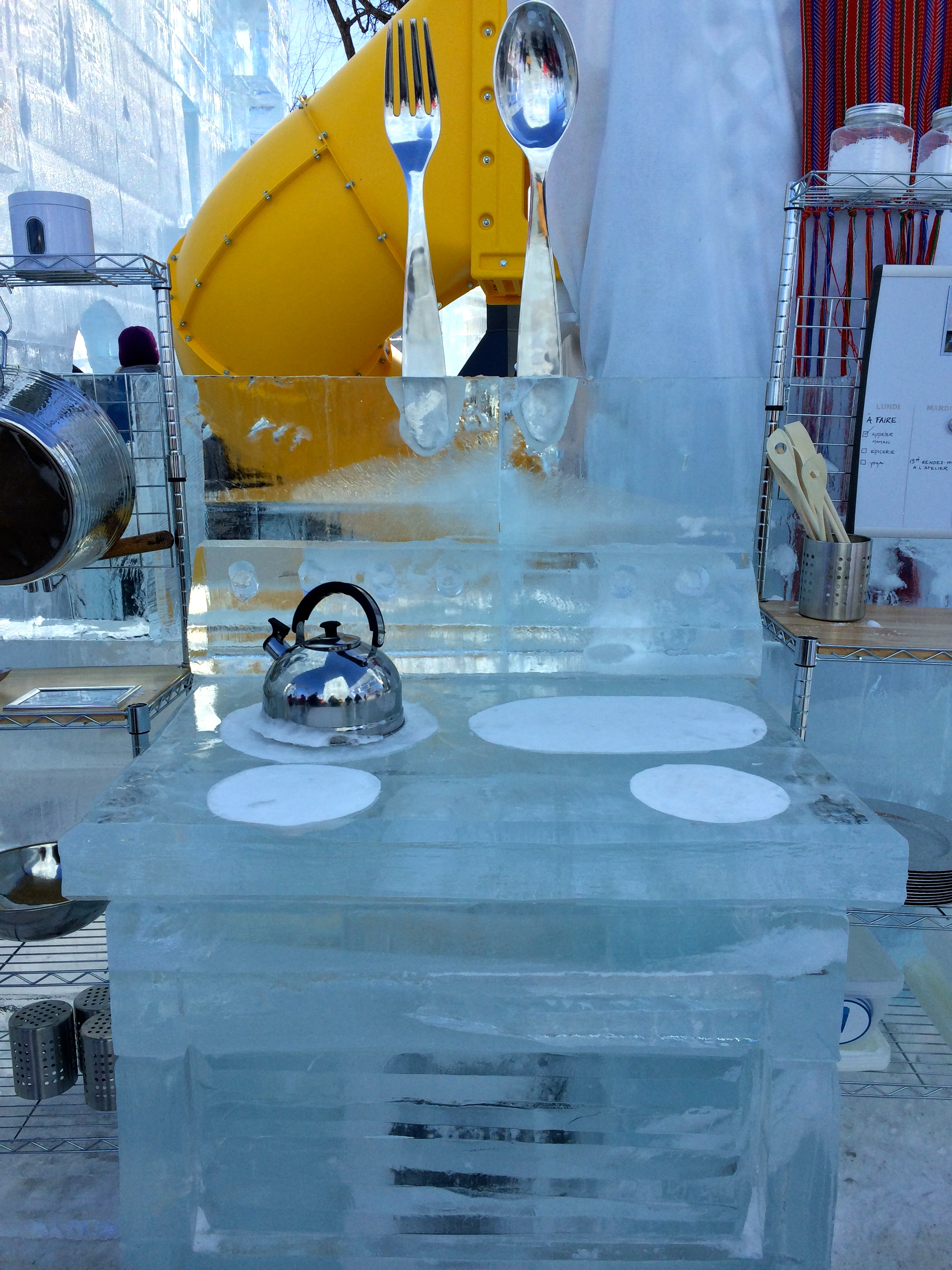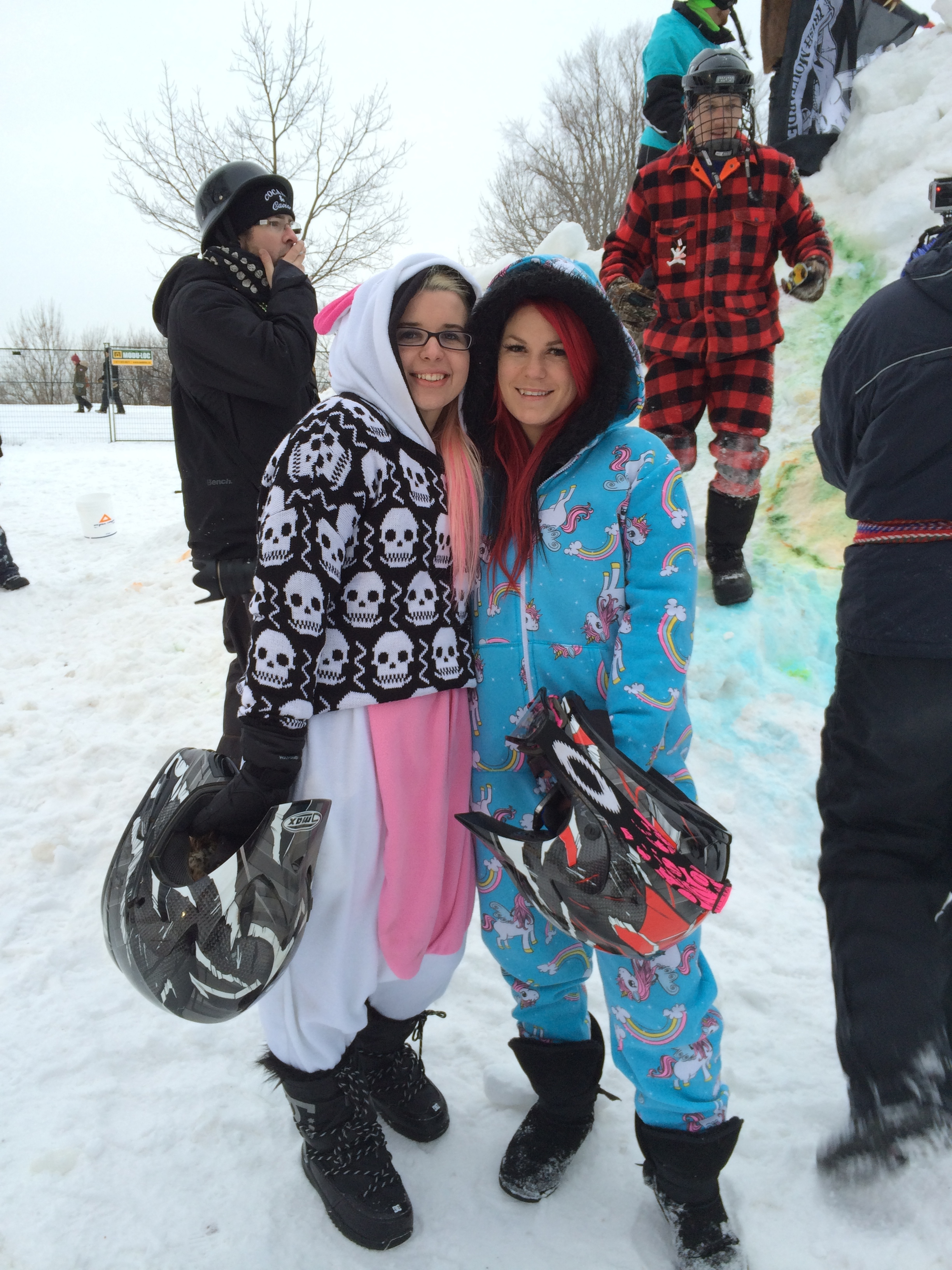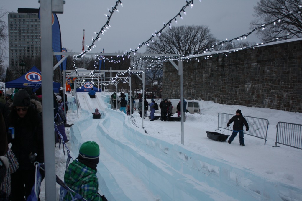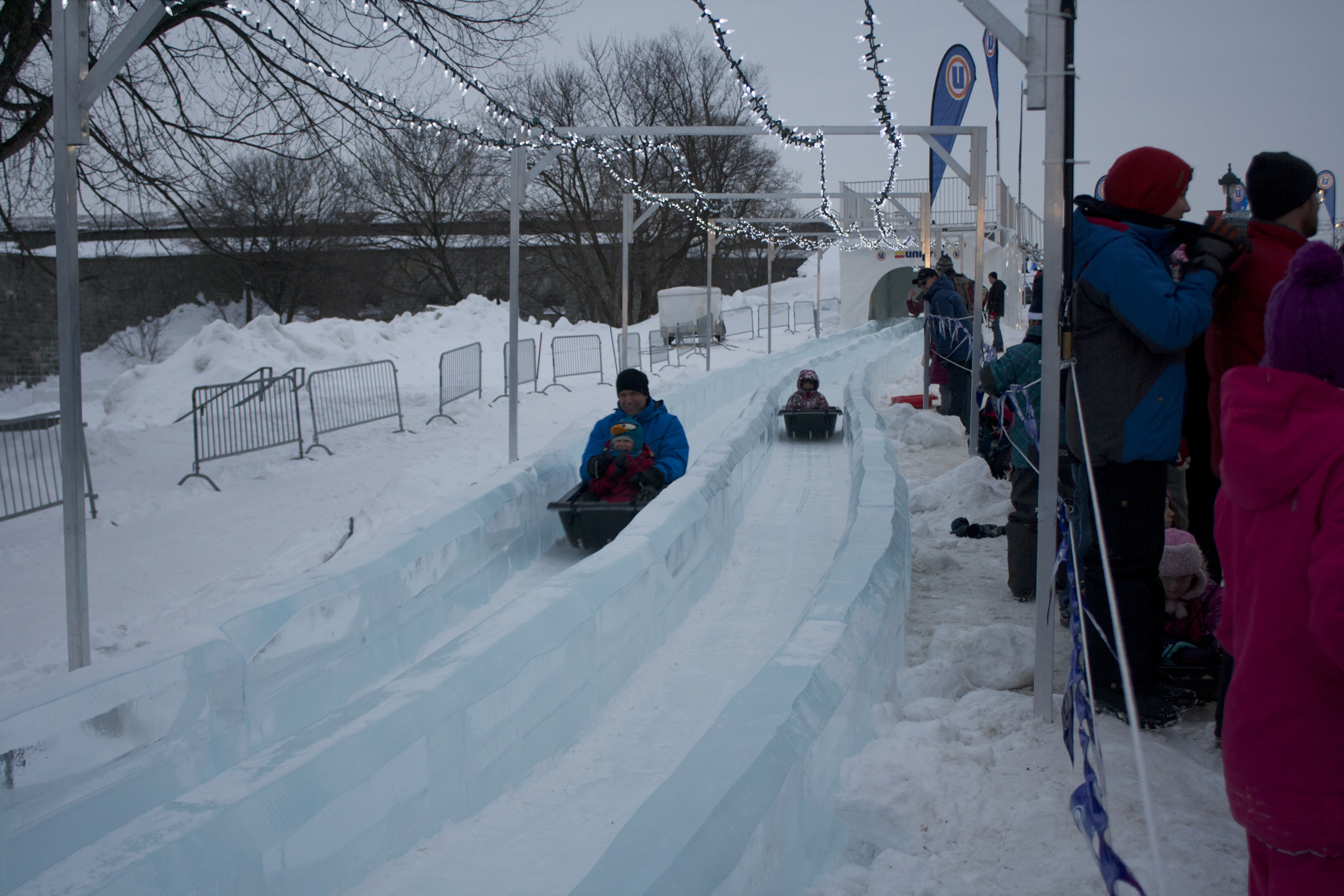Moi qui avais jusque là surtout exploré le nightlife (et différentes variations sur le thème du caribou), j’ai fait cette fois-ci comme tous les parents: je me suis tapé la ligne interminable pour la Glissade de glace Uniprix. Eh oui. Si ça valait le coup d’attendre une bonne heure? «OUIIIIII!» vous répondrait sans aucun doute le fruit de mes entrailles. Idem pour les chambres à air, qui nous ont permis de dévaler les couloirs enneigés (sept cette année, soit quatre de plus qu’en 2013!) mis à la disposition des «carnavaleux» en mal de sensations fortes. Vous l’aurez compris, j’ai mis au monde une adrénaline junkie (je me demande bien où elle a pris ça). Et mon pauvre Chéri n’a pas trop le choix de nous suivre dans nos délires…
