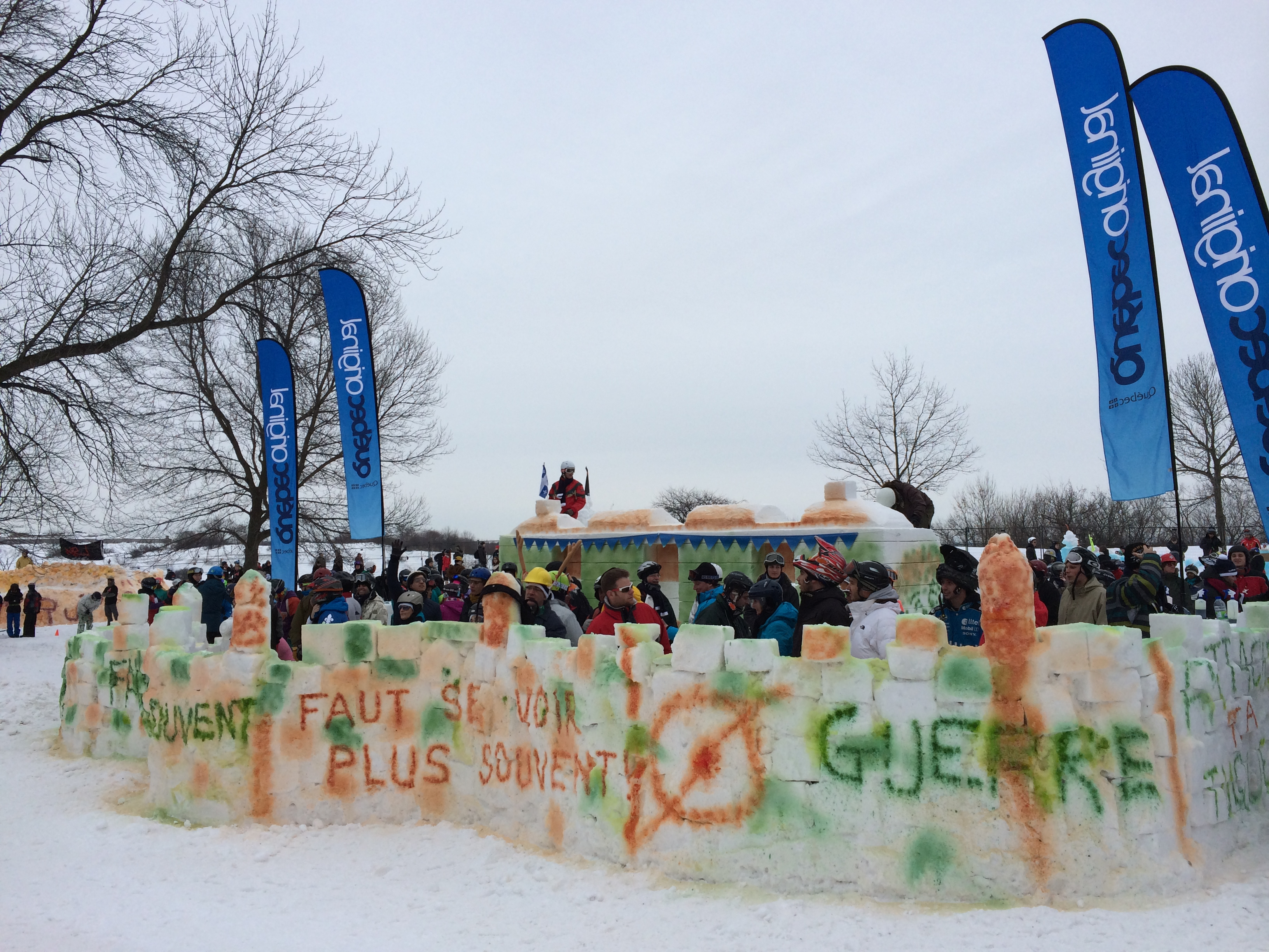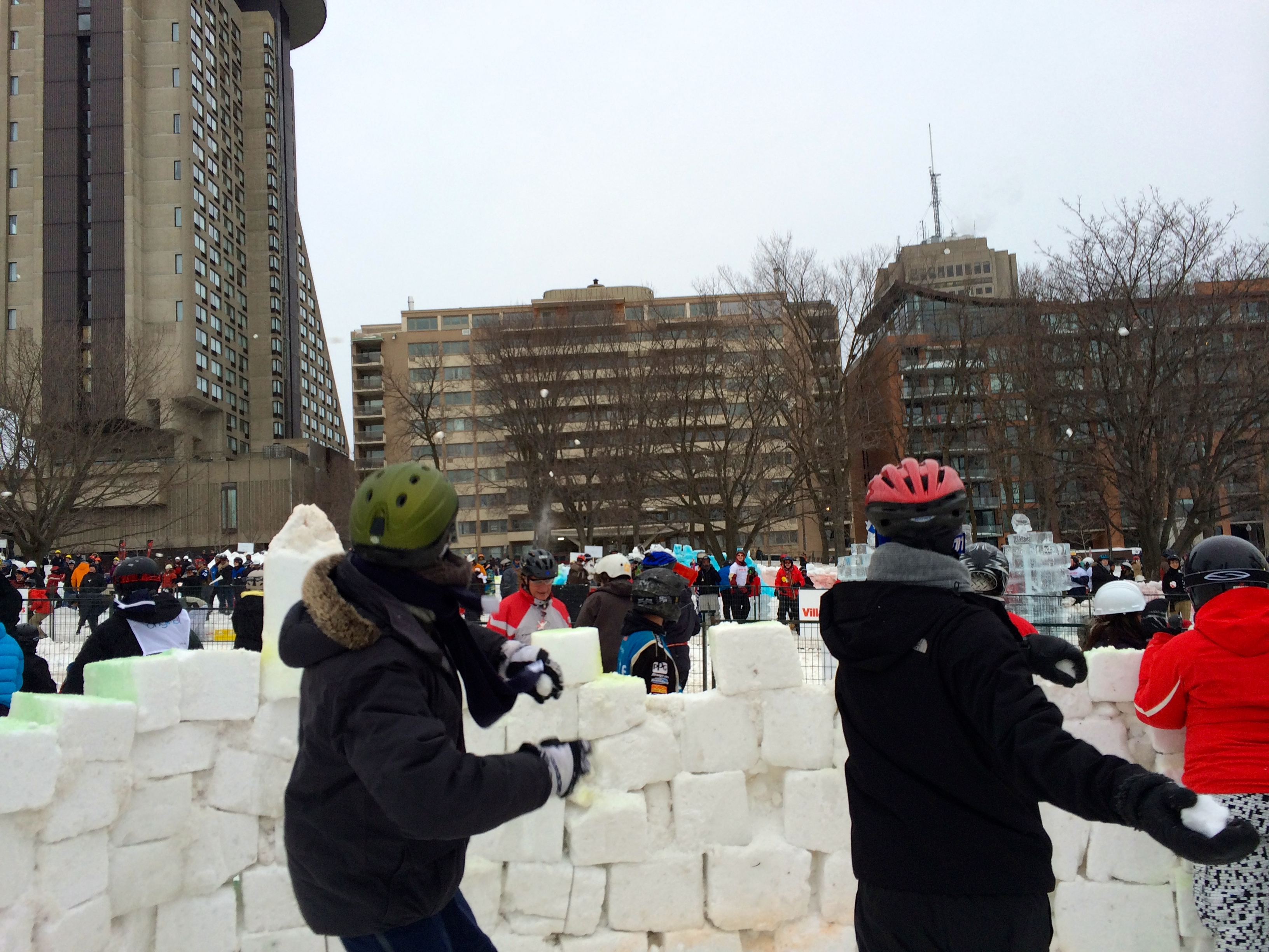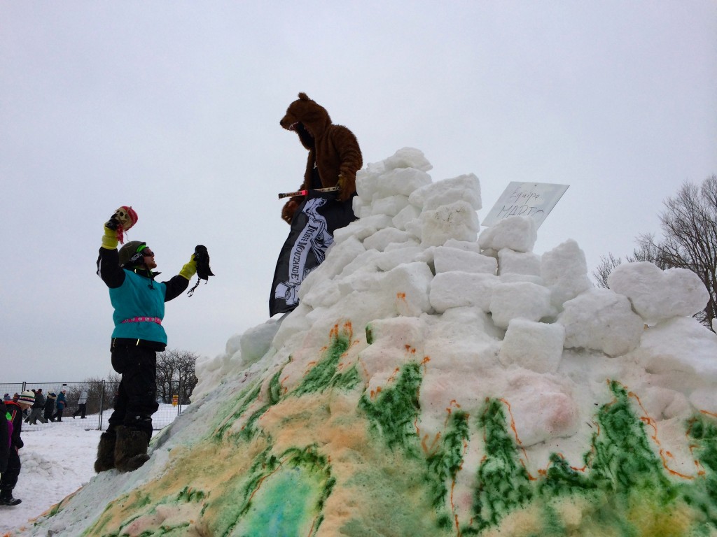 Mon coup de coeur perso? La guerre des ducs. Les premières secondes m’ont procuré de grands frissons. Oui, je suis une nostalgique de La guerre des tuques. Nah! Je ne veux pas grandir!!! Seul hic: je suis arrivée trop à la dernière minute pour me fabriquer des munitions. J’ai donc assisté à la guerre depuis le champs de bataille, iPhone à la main pour croquer la scène. Malgré tout, quel trip! L’animateur annonçait déjà que l’activité serait de retour l’an prochain alors que les balles commençaient à peine à fuser. On verra bien (vous avez sûrement vu les articles à propos de la tentative avortée de battre le record Guinness vous aussi). Chose certaine, je me promets d’arriver plus tôt et de participer à la construction d’un fort si j’y retourne l’année prochaine!