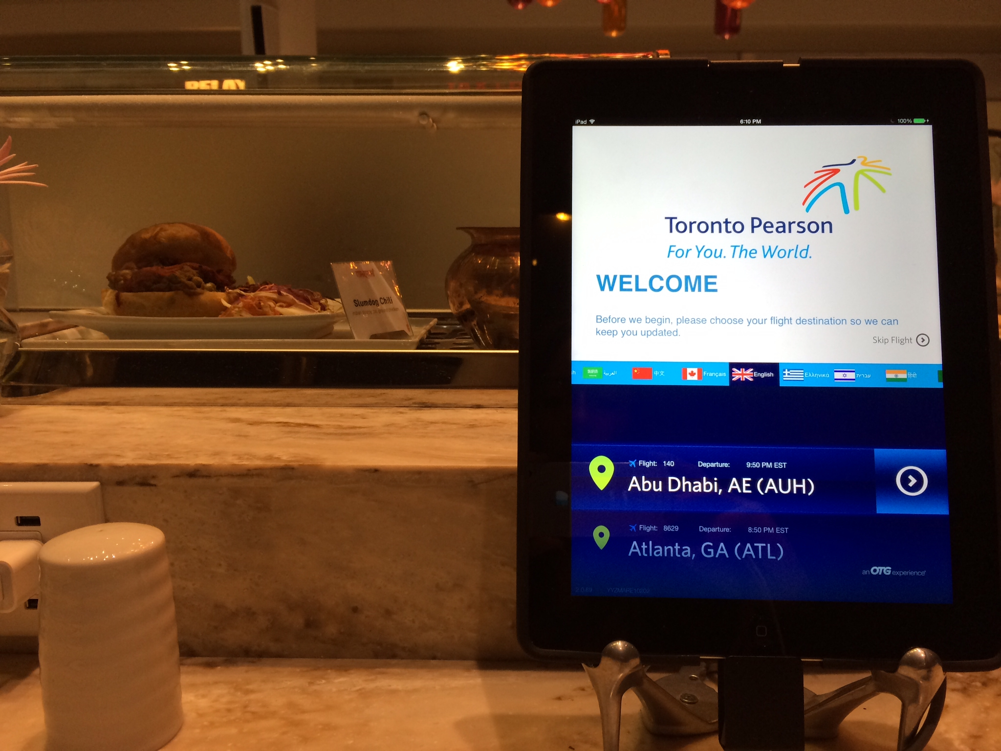 J’ai rarement le loisir d’explorer autant que je le souhaiterais, remarquez. Mais ce soir de février, alors que j’avais deux bonnes heures à tuer à l’aéroport Pearson, je me suis laissée convaincre par l’annonce d’un restaurant sur la page d’accueil de l’aéroport (oui, celle qui apparaît par défaut quand on se connecte à WiFi). Un seul mot a été nécessaire: indian. Je raffole de cuisine indienne (au point que l’Inde est l’un des pays où j’ai pris le plus de poids). J’avais envie d’un plat bien relevé.