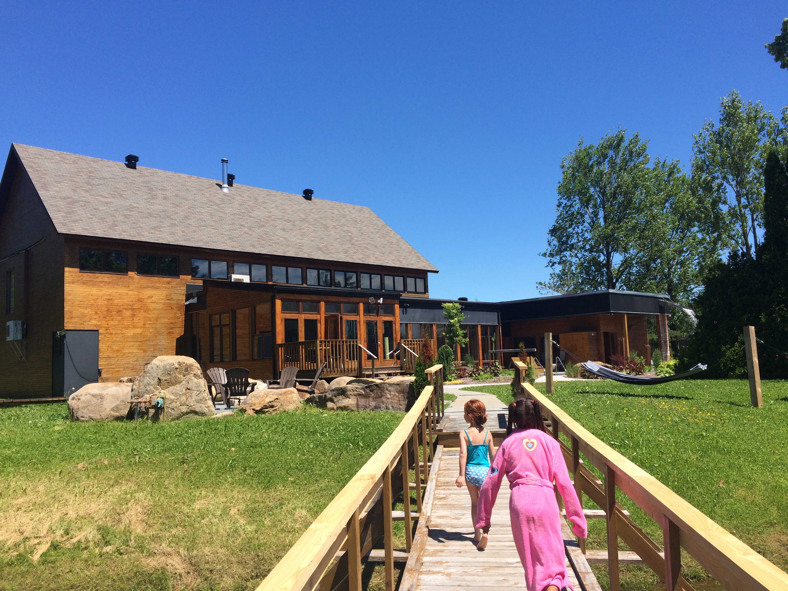De quoi avions-nous le plus besoin après des semaines de rush intense (de mon côté, notamment à cause de ceci et cela) et avant d’avaler les kilomètres jusqu’à l’Archipel-de-Mingan? De REPOS! Nous avons donc répondu (que dis-je: nous avons plutôt CRIÉ) OUI à l’invitation de Nordique Spa, dont l’établissement de Stoheham célèbre son 10e anniversaire cette année. Avec nos fillettes de cinq et huit ans, nous avons plutôt mis le cap sur celui du Mont Sainte-Anne, où les enfants sont admis tous les matins entre 10h et 13h pendant l’été.