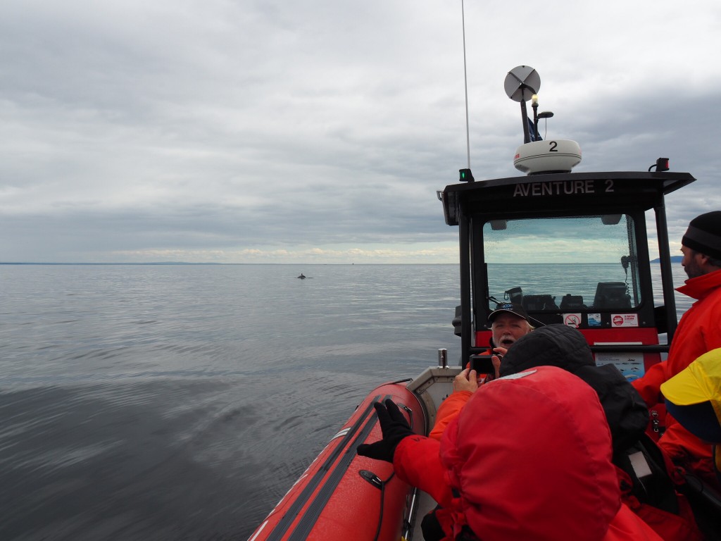 Nous ne sommes pas partie depuis quinze minutes que le vent tourne. Un petit rorqual! Un rorqual commun! Un béluga! Un autre! Encore un autre! Et un auuuuuutre!!!!!!!!!