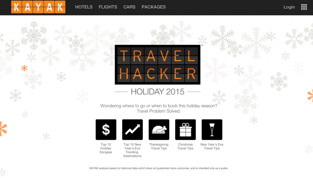 Une autre piste intéressante pour Noël: aller fouiner sur la section spéciale de Kayak, Kayak, Holiday Travel Hacker. Dans ce dernier, on nous donne entre autres une liste de 10 destinations qui ont vu le prix des billets d’avion diminuer pour la période des Fêtes. Le no. 1 de cette liste est Hong Kong (après, faut voir si c’est un bon moment pour y aller…).