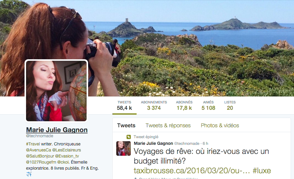 À lire également: Mon utilisation de la techno en voyage, 30 photographes de voyage à suivre sur Instagram, Twitter, une drogue douce, Twitter en travaillant, Du virtuel au réel, Twitter à TVA, Mes amis les stars.