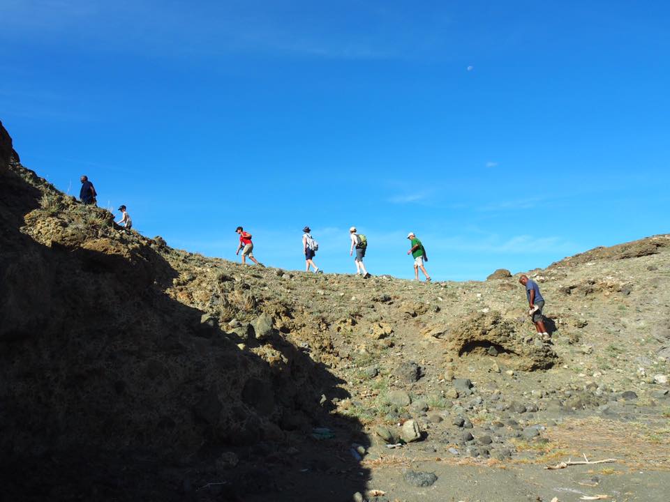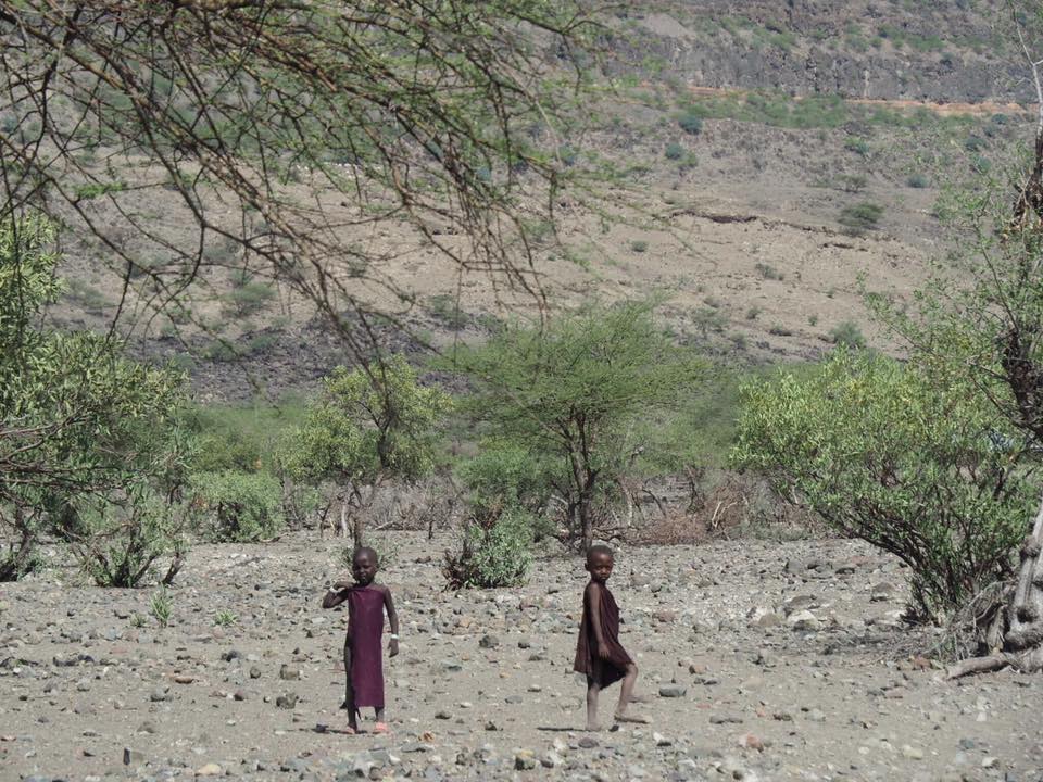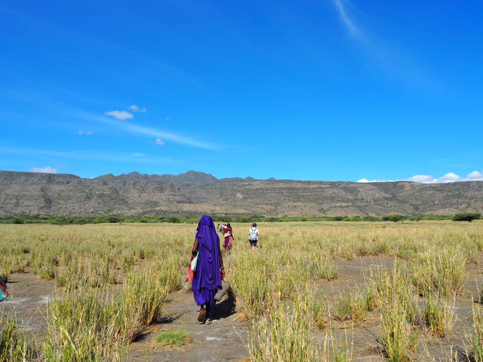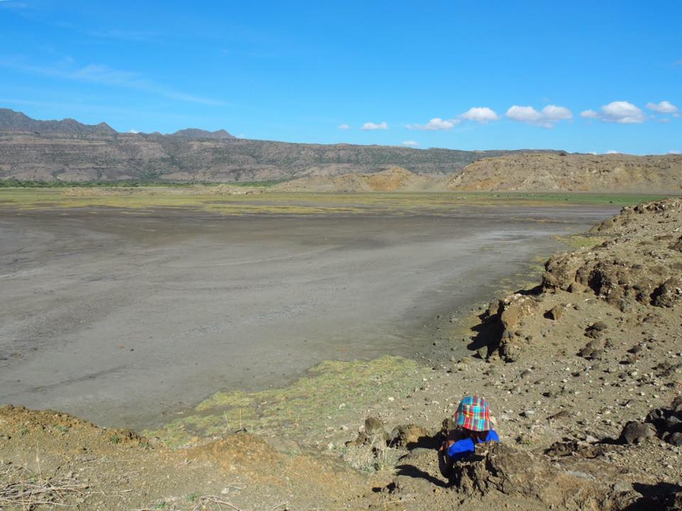 Aucun point d’ombre ne permet de prendre de pause pendant les deux tiers du parcours. Au loin, nous apercevons des zèbres et des gnous. Nous nous arrêtons pour scruter l’horizon depuis une petite butte. Maya se réfugie dans l’ombre d’un escarpement, incommodée par la chaleur.