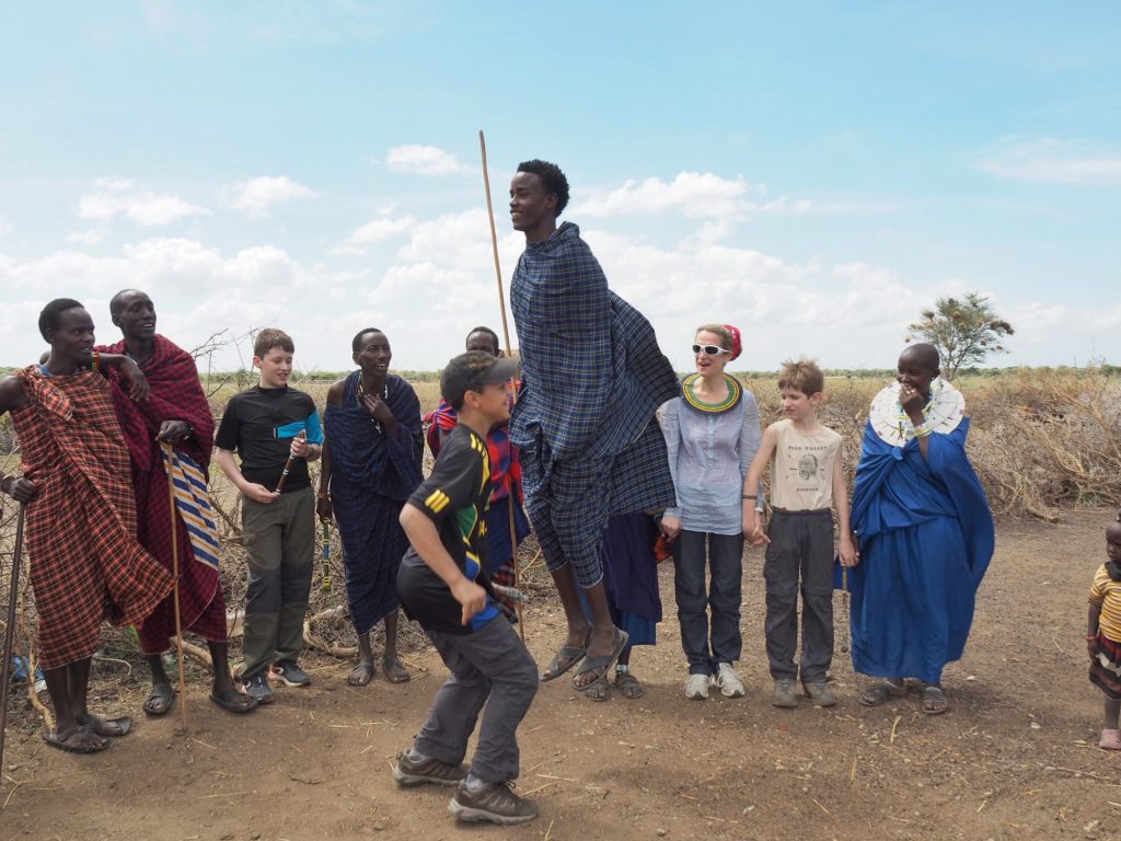 On saute le plus haut possible ! Celui qui est dans les airs est l’un des fils du chef et notre guide.
