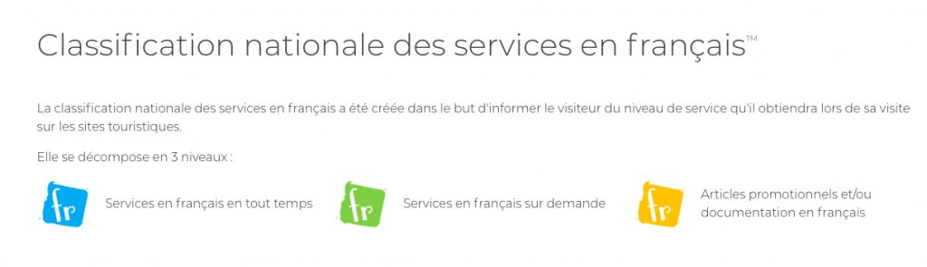 Puisque le niveau de français n’est pas toujours le même d’un endroit à l’autre, un système de classification permet de savoir si l’on peut y avoir des services en français en tout temps (pictogramme bleu), sur demande (pictogramme vert) ou si l’on trouve seulement de la documentation dans la langue de Louis Riel (pictogramme jaune). Ainsi, pas de mauvaises surprises : on sait exactement à quoi s’attendre.