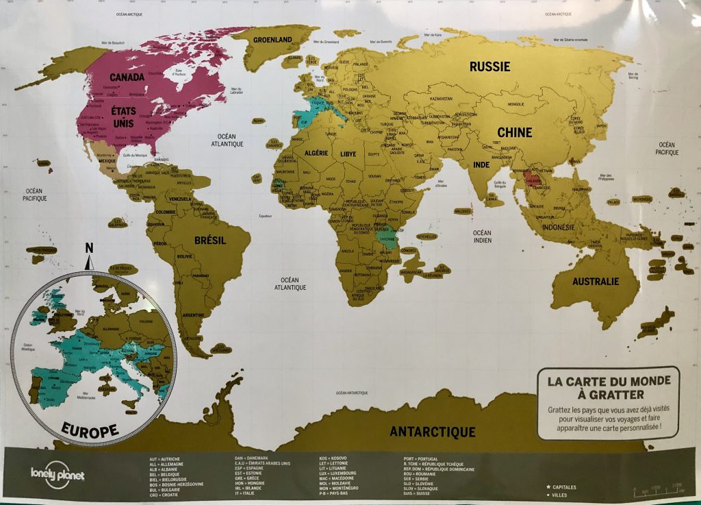 La carte à gratter de ma fille. Chaque fois qu’elle revient de voyage, elle gratte le pays visité. Un cadeau qui fait plaisir autant aux ados qu’aux adultes voyageurs ! (À noter que celle-ci, offerte par Lonely Planet, n’est pas en vente, mais qu’on en trouve des semblables, de différents formats, un peu partout.)