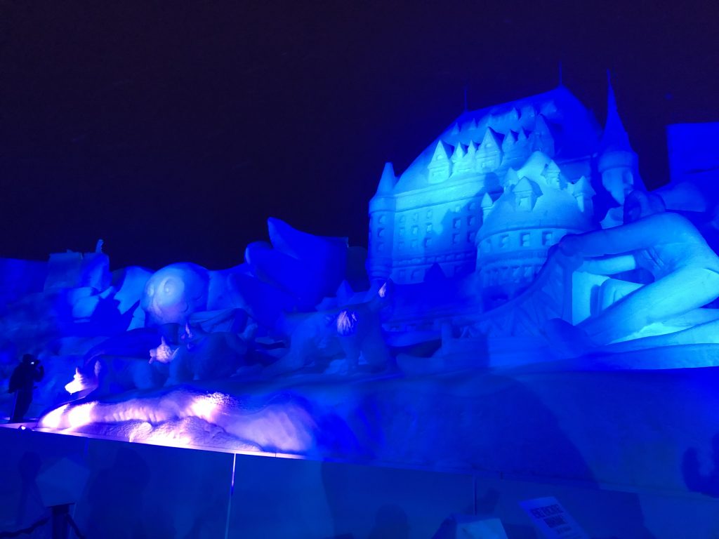On a fait grand cas de la gigantesque sculpture de neige, qu’il est impossible de manquer en arrivant dans la Cour royale de Bonhomme et avec raison. Environ 65 000 tonnes de neige ont été nécessaire pour ériger cette oeuvre qui mesure 30 pieds de haut. Outre le Château Frontenac, un harfang des neige, une ceinture fléchée, une course de canots et un traîneau à chiens se révèlent quand on prend le temps de la scruter. Impressionnant !