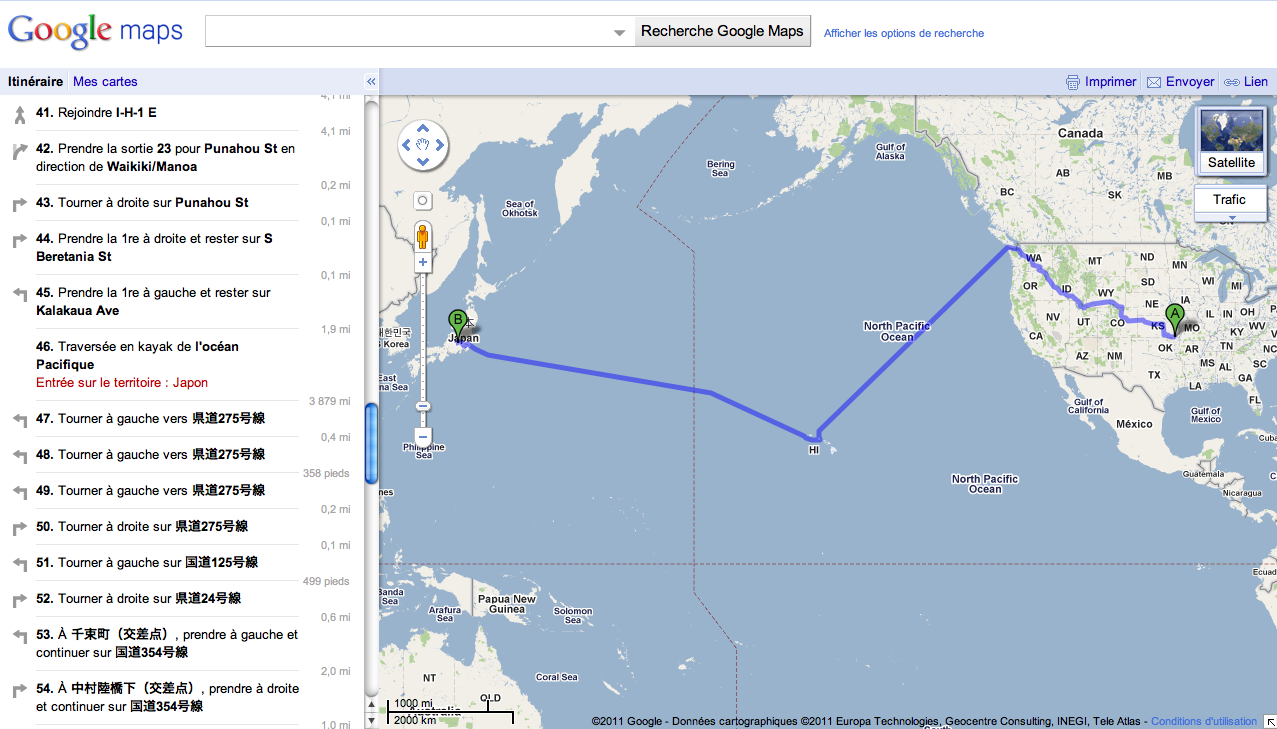1. Allez sur Google Maps et cliquez sur «ITINÉRAIRE» 2. Écrivez «USA» comme origine 3. Écrivez «Japon» comme destination 4. Lisez le point 46… et take a kayak! J’ai refait l’exercice ce matin et je…