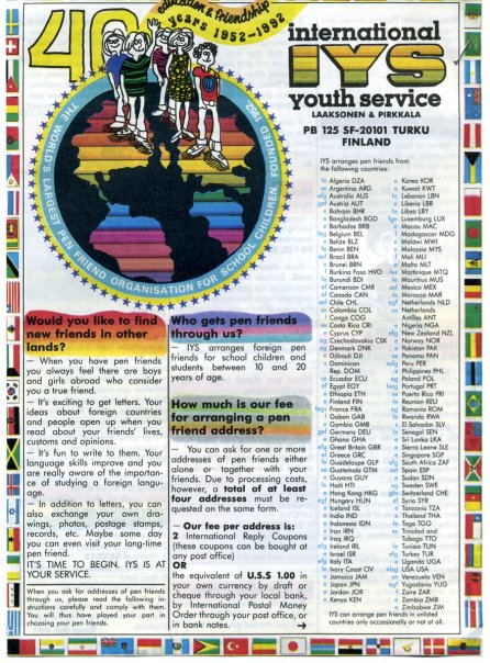 L’agence s’appelait IYS – International Youth Service. Leur mission: mettre en contact des jeunes correspondants des quatre coins de la planète. Vous dire à quel point j’ai voyagé en regardant leur dépliant! J’ai beaucoup…